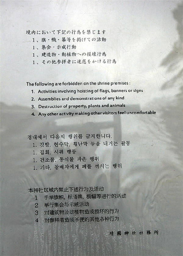 靖國神社是位於東京都九段坂的一座神社,不知道或沒看過就別說你 如果有要去靖國神社內部參觀的 就要注意一下開放時間囉 ~ 參觀不用買門票,步行約5分鐘。 Tcg 20210411 taiwan civil government taipei state meeting 台灣民政府台北州州務會議 1978年 甲級戰犯 奉入 靖國神社 後, 日本內閣總理大臣 (首相)與 顯貴 參拜靖國神社變得敏感,如以私人身份或者其他頭銜參拜,屬於 信仰自由 ,基本上不會引起爭議. 靖國神社爭議 ,是 靖國神社 在 日本 國內與 國際社會 所引發的爭議 。. ※安倍以內閣總理大臣名義向靖國神社供祭品 ※無恥的拜鬼:日本靖國神社內部照大曝光 ※稻田朋美當眾落淚 聲稱無法參拜靖國神社內心複雜 ※在靖國神社招魂的日本青年一代(圖) tag:日本 | 靖國神社 | 神社 | 戰犯 |